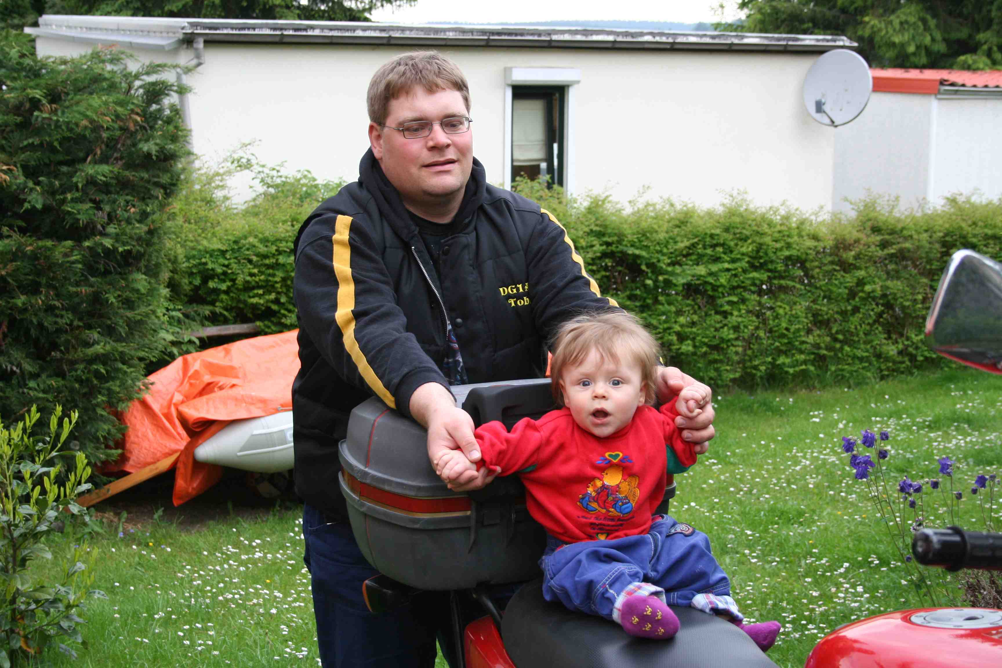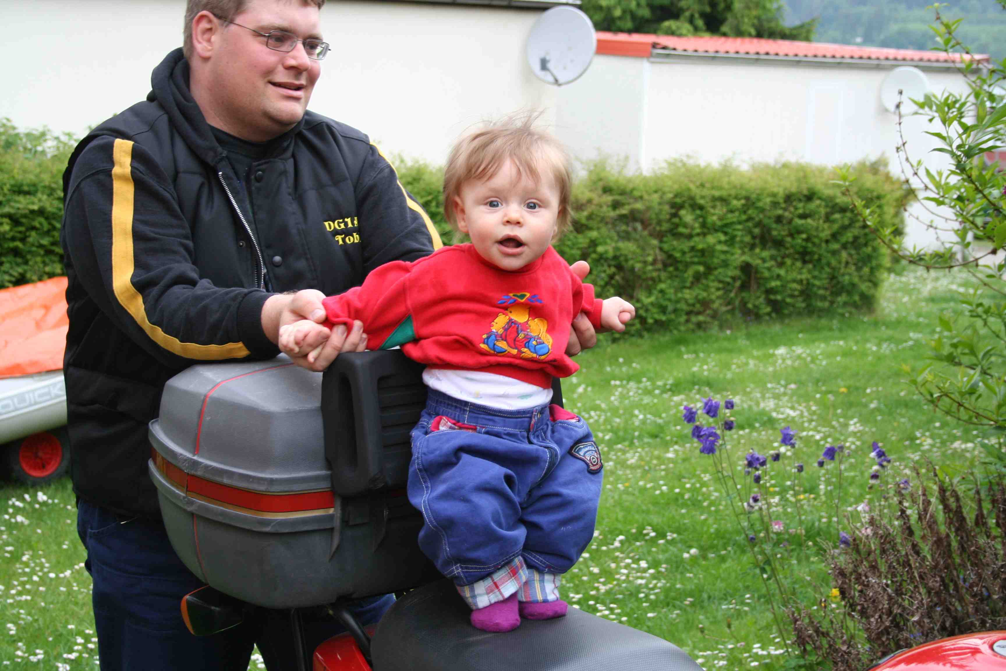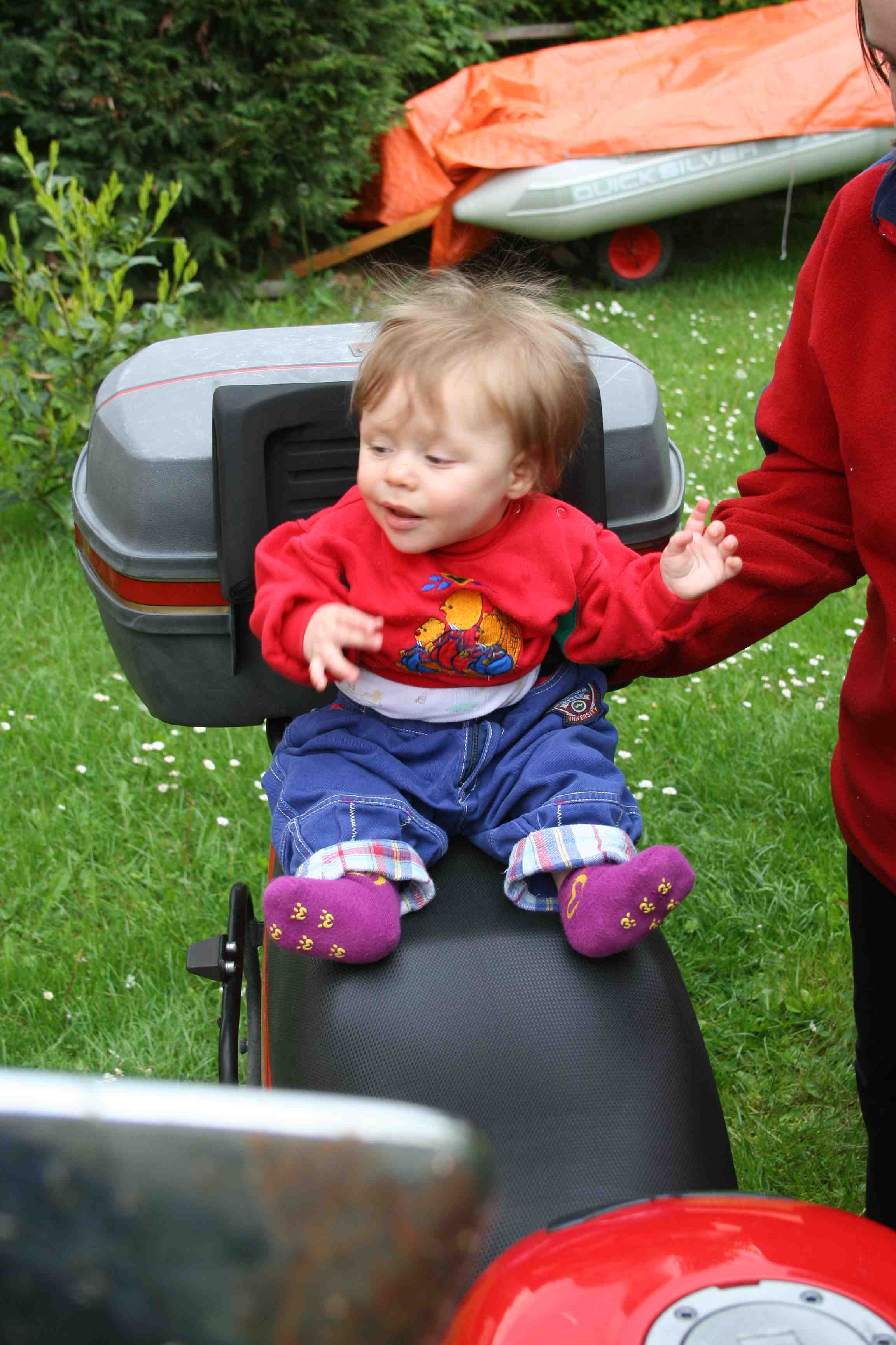 … hier mitfahren. Sitzen kann ich ja schon hier hinten drauf.