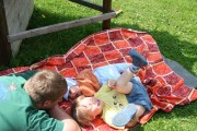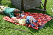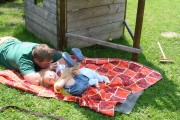Heute machen meine Eltern gemütlichen Sonntag, Papa bastelt Netzwerk / Telefon / Webcam für den Garten und ich darf im Garten auf der Decke liegen. Mein Bruder turnt um mich rum, schaukeln, klettern bauen und auch mich knuddeln.