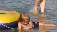 Spielt Ihr auch Ball im Wasser ? Wenn das so flach ist, kann auch Nick mitspielen. Was macht Schwimmen mit Papa?